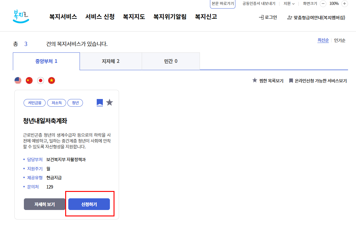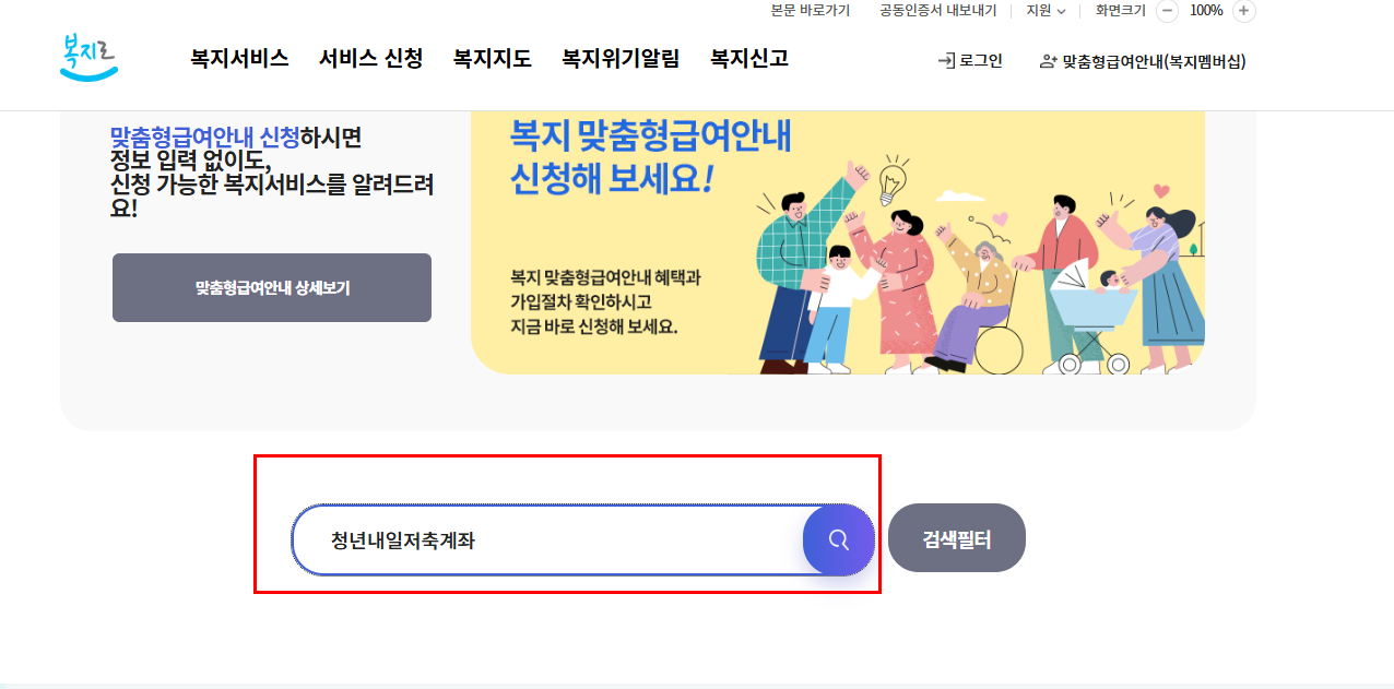 • 복지로 홈페이지 접속 → '청년내일저축계좌' 검색 → 본인 인증 후 신청서 작성 및 제출