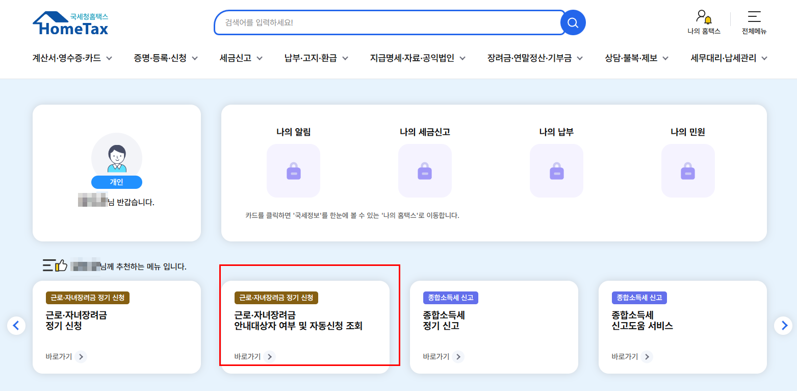 국세청에서 발송하는 장려금 신청 안내문을 받은 경우는 대부분 자격을 충족합니다. 하지만 개별적으로도 아래 방법으로 조회할 수 있습니다.